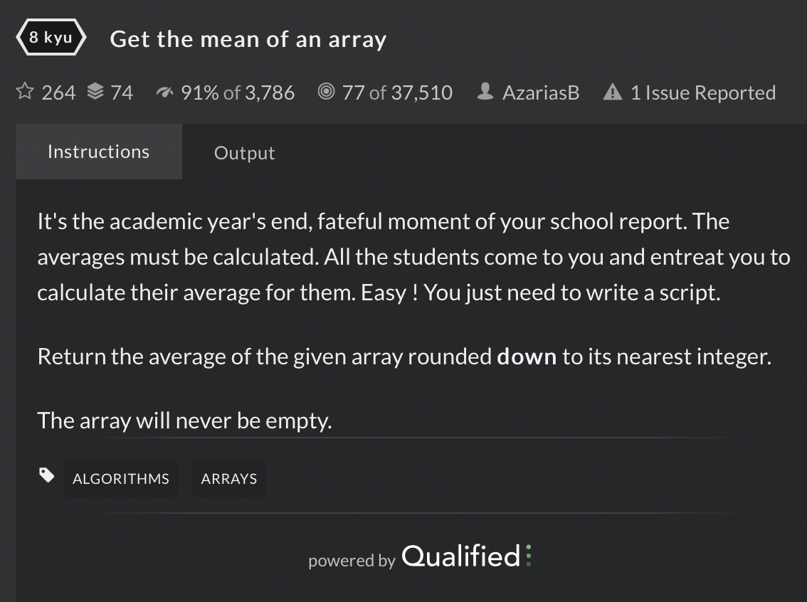 | Get the mean of an array by CodeWar (0) | 2021.04.09 |